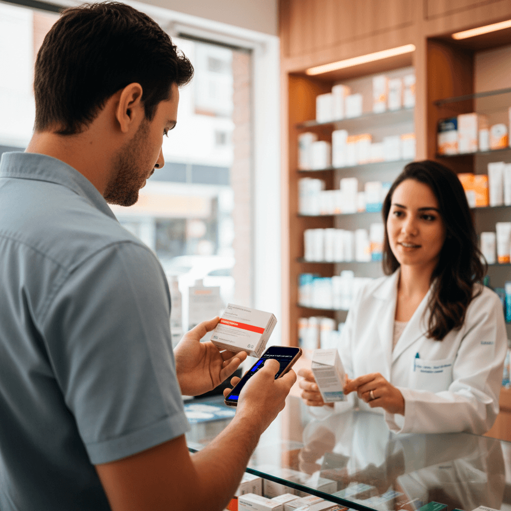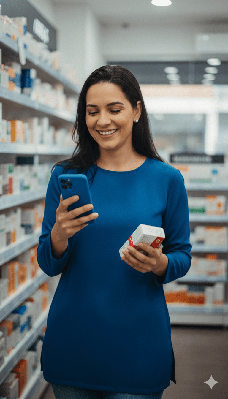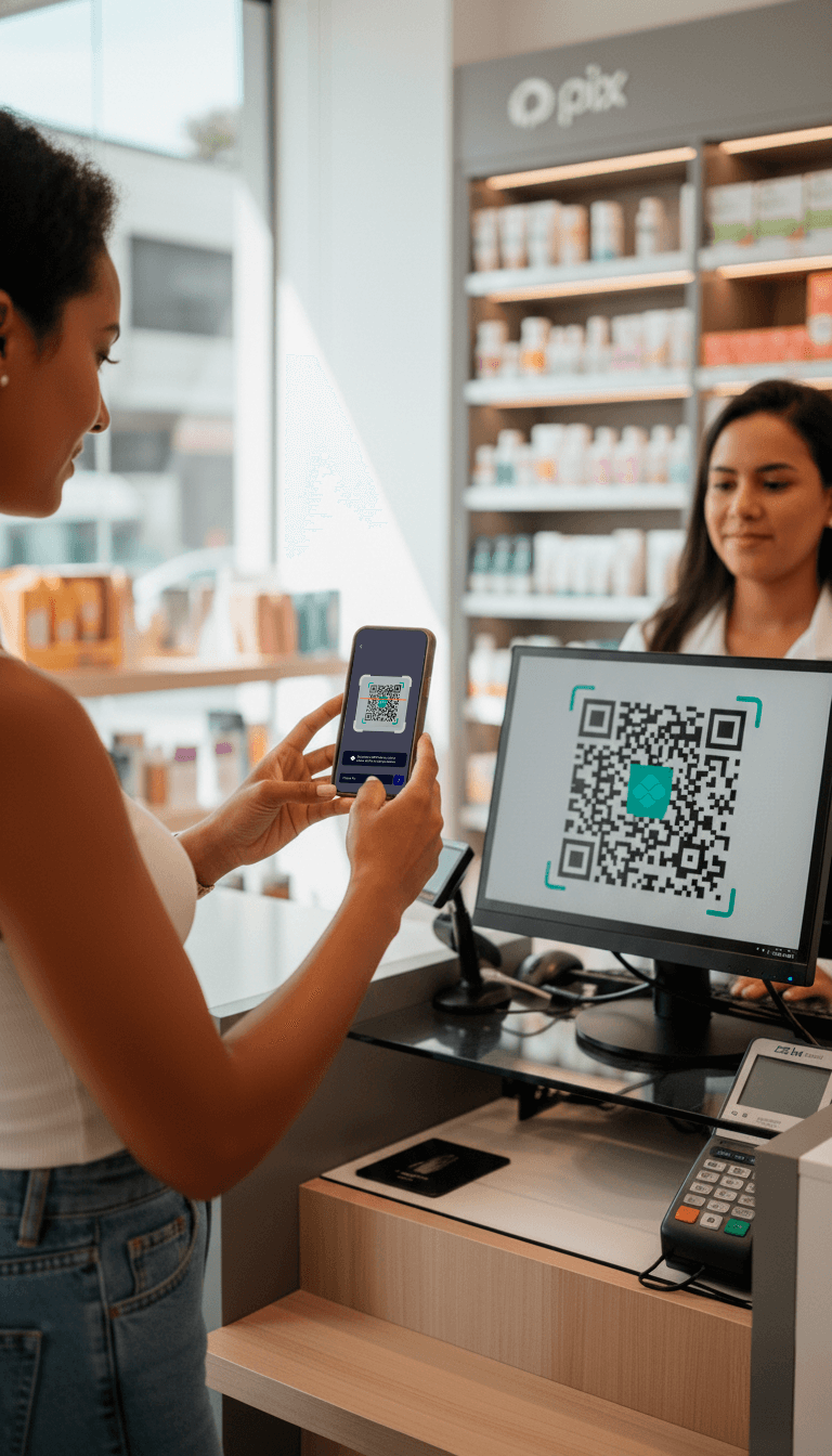 Peça ao caixa da farmácia o QR code do PIX ou a chave PIX e pague diretamente via app.